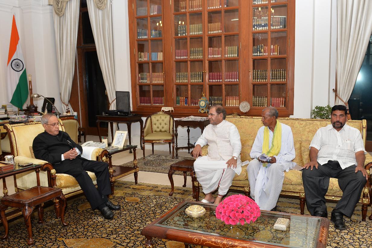The President of India, Shri Pranab Mukherjee meeting with Shri Sharad Yadav, MP (RS) alongwith Shri Heera Singh Markam, National President, Godwana Gantantra Party, at Rashtrapati Bhavan, in New Delhi on September 18, 2015.