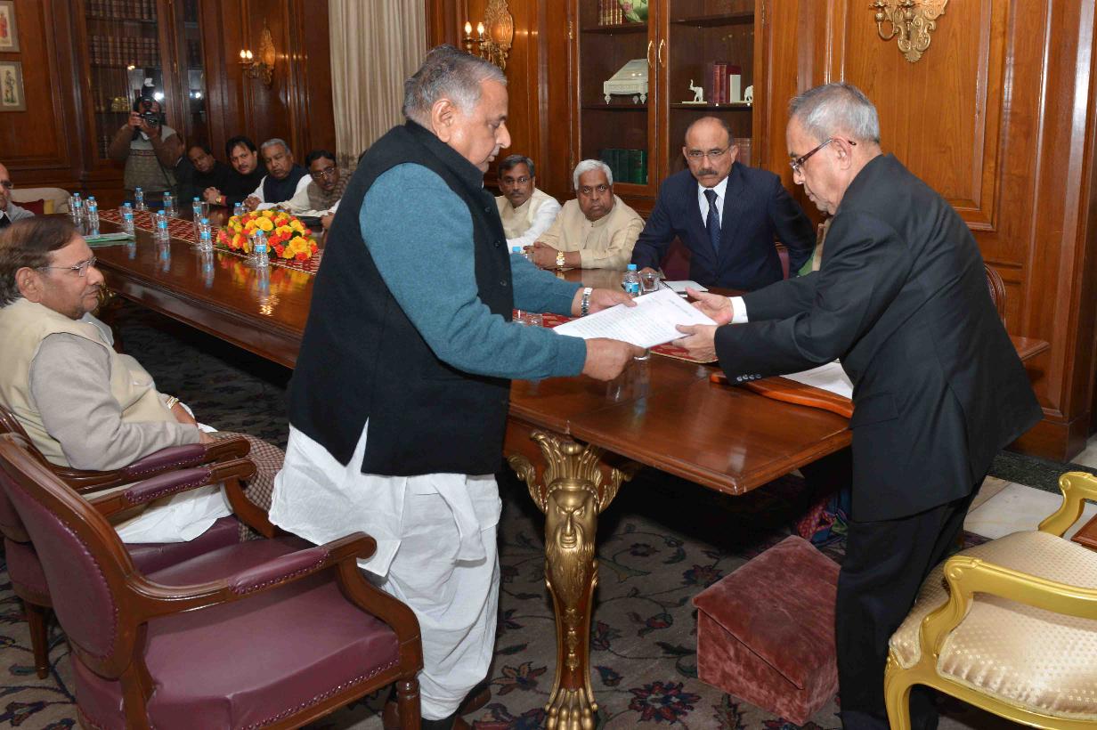 The President, Janta Dal United, Shri Sharad Yadav, the President, Rashtriya Janta Dal, Shri Lalu Prasad, the President, Swajwadi Party, Shri Mulayam Singh Yadav, the Member Parliament (Rajya Sabha), Shri KC Tyagi with Others, meeting the President of India, Shri Pranab Mukherjee, at Rashtrapati Bhavan, in New Delhi on February 11, 2015.