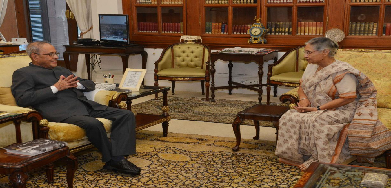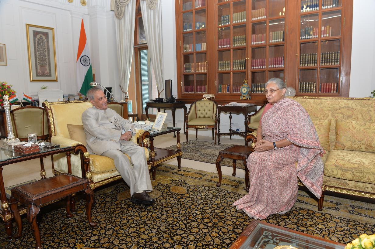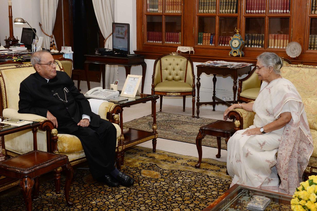 The President of India, Shri Pranab Mukherjee meeting with the former Governor of Kerala, Smt. Sheila Dikshit, at Rashtrapati Bhavan, in New Delhi on June 24, 2015.