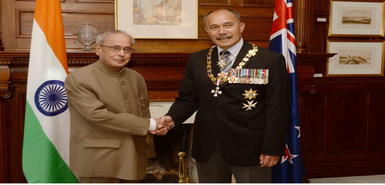 The President of India, Shri Pranab Mukherjee meeting with the Governor General of New Zealand, H.E. Lieutenant General, The Rt. Hon ble Sir Jerry Mateparae, GNZM, QSO, at Government House in New Zealand on April 30, 2016.