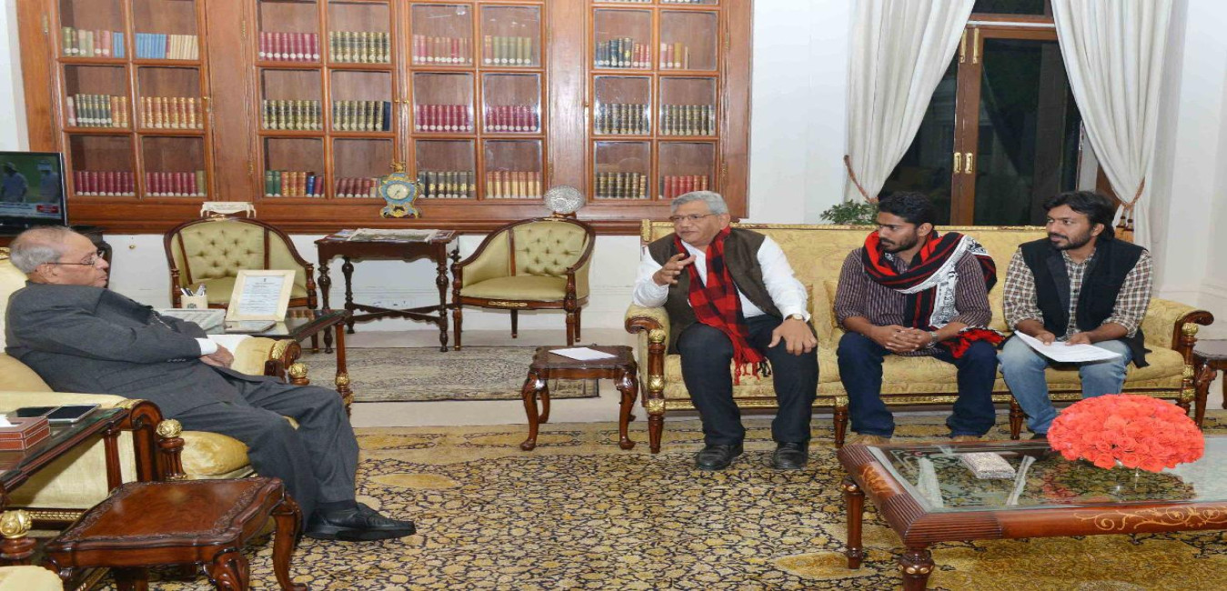 The President of India, Shri Pranab Mukherjee meeting with Shri Sitaram Yechuri, MP (RS) along with Shri Mohit K. Pandey and Shri Amal P.P. , students of Jawaharlal Nehru University, at Rashtrapati Bhavan on February 17, 2017.