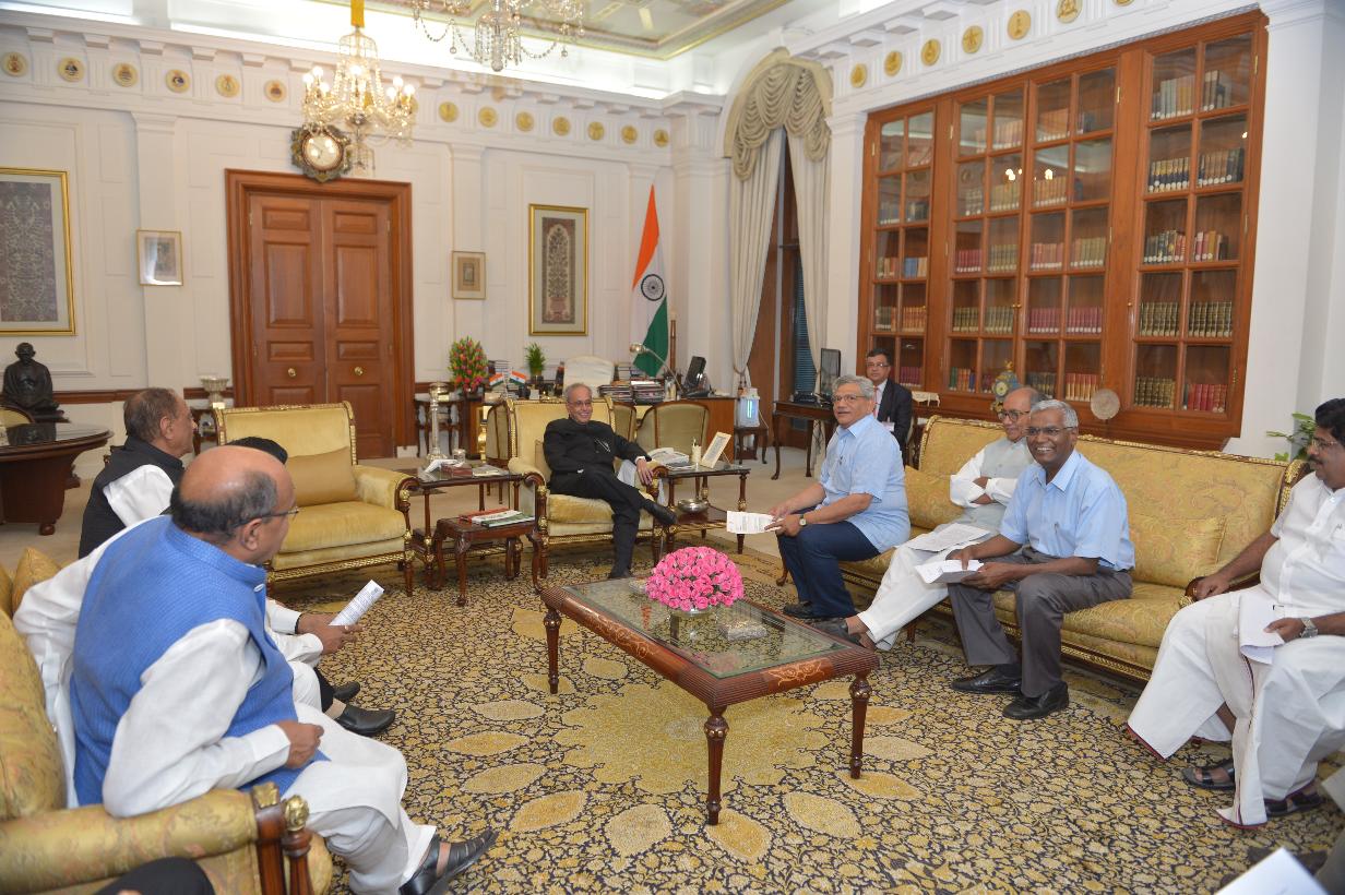 The President of India, Shri Pranab Mukherjee meeting with Shri Sitaram Yechuri, MP (RS) alongwith other MPs from Left Parties, at Rashtrapati Bhavan on May 06, 2016.