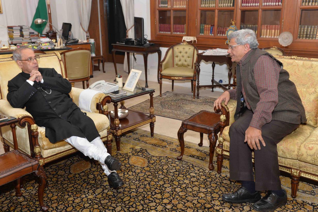 The President of India, Shri Pranab Mukherjee meeting with Shri Sitaram Yechury, MP (RS), at Rashtrapati Bhavan on February 10, 2016.