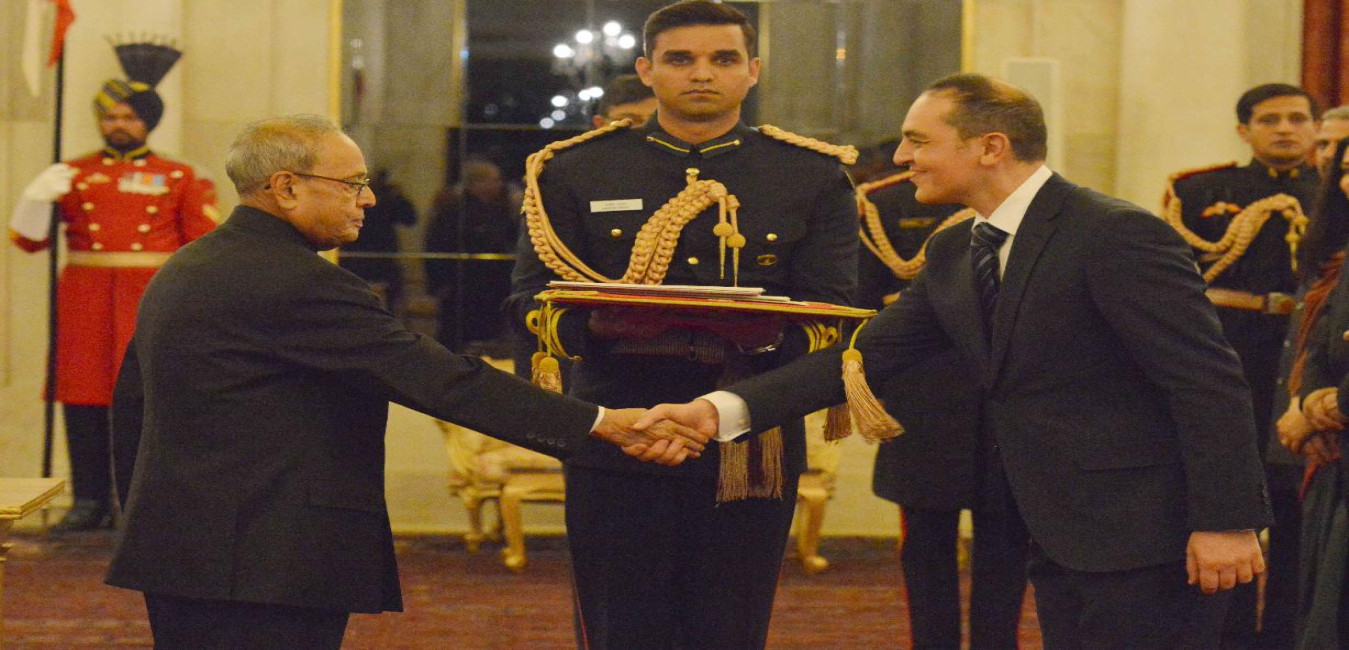 The High Commissioner-designate of Malta, HE Mr. Stephen Borg presenting his Credentials to the President of India, Shri Pranab Mukherjee, at Rashtrapati Bhavan on February 03, 2016.