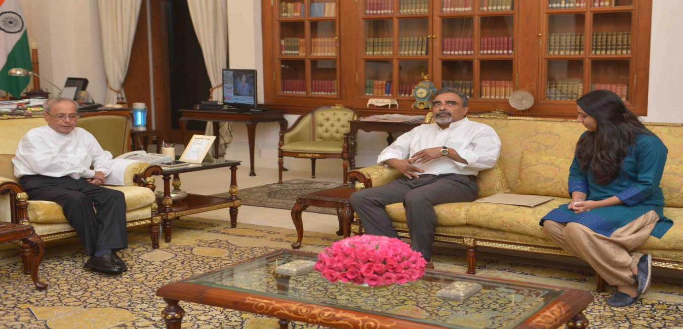 The President of India, Shri Pranab Mukherjee meeting with Shri Suman Chattopadhyay along with his daughter Ms. Tupur Chattopadhyay, at Rashtrapati Bhavan on April 10, 2016.