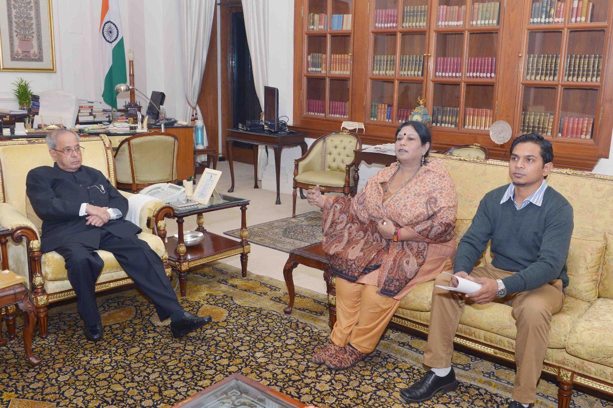The President of India, Shri Pranab Mukherjee meeting with Smt. Sunanda Singh from Sarvodaya Ashram, Birbhum alongwith her son Shri Aditya Singh, at Rashtrapati Bhavan on December 03, 2015.