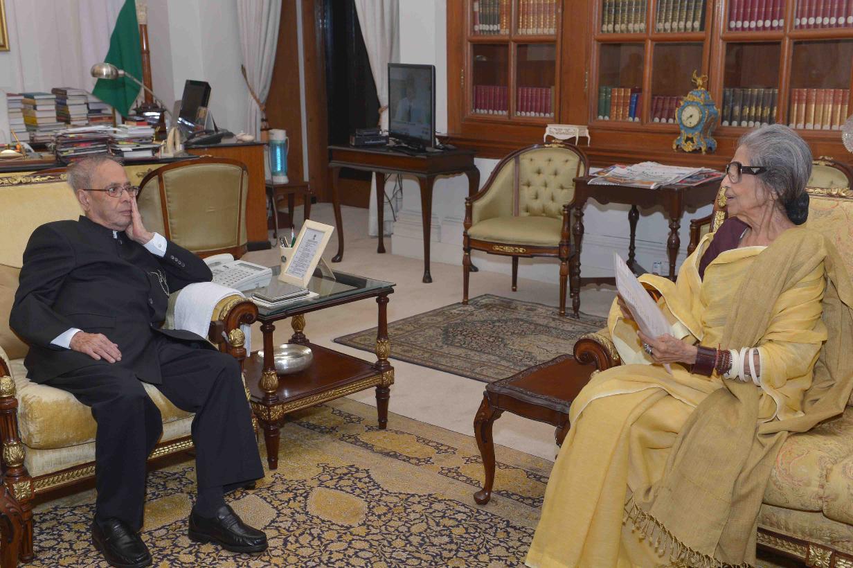 The President of India, Shri Pranab Mukherjee meeting with the Chairperson, Kasturba Gandhi National Memorial Trust, Smt. Tara Gandhi Bhattacharjee, at Rashtrapati Bhavan, in New Delhi on June 08, 2015.