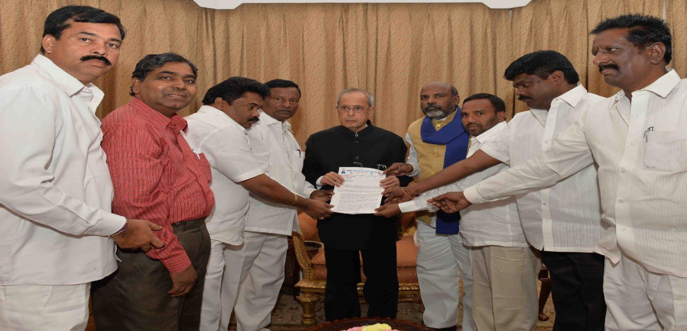 The President of India, Shri Pranab Mukherjee meeting with Shri Yathakula Bhaskar Madiga with others, at Rashtrapati Nilayam, Bolarum, in Secunderabad on December 30, 2015.