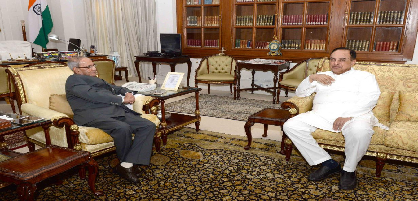 The President of India, Shri Pranab Mukherjee meeting with Dr. Subramanian Swamy, MP (RS), at Rashtrapati Bhavan on June 22, 2017.