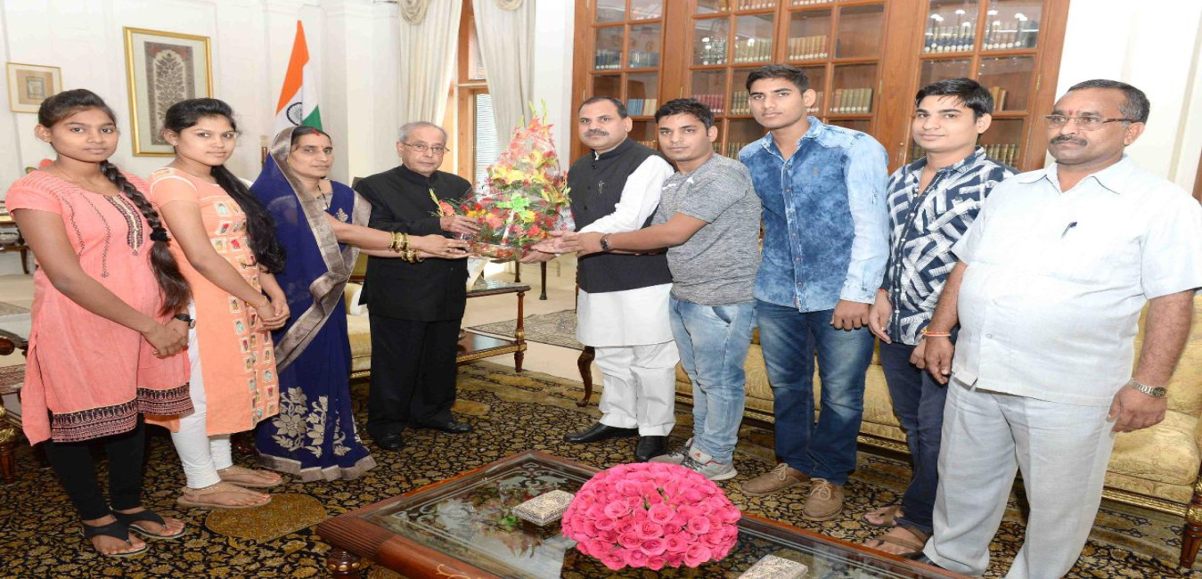 The President of India, Shri Pranab Mukherjee meeting with Shri Narendra Kumar Sand and family from Jaipur, at Rashtrapati Bhavan on June 23, 2017.
