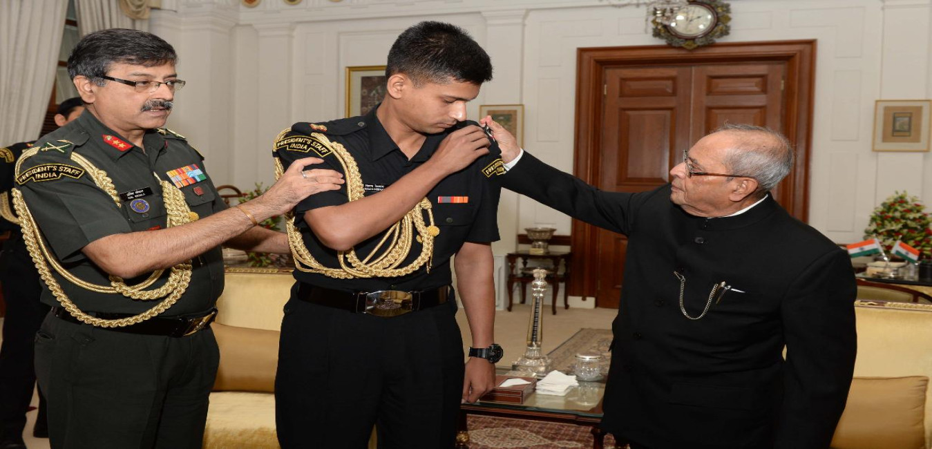The President of India, Shri Pranab Mukherjee meeting with Capt. Arko Kiran Debnath, ADC to the President, at Rashtrapati Bhavan on June 23, 2017.