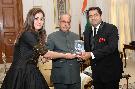 The President of India, Shri Pranab Mukherjee receiving a copy of the book ''Astro and Vastu Solution'' from Smt. & Shri Vaneet Sharma from San Francisco, at Rashtrapati Bhavan on June 22, 2017.