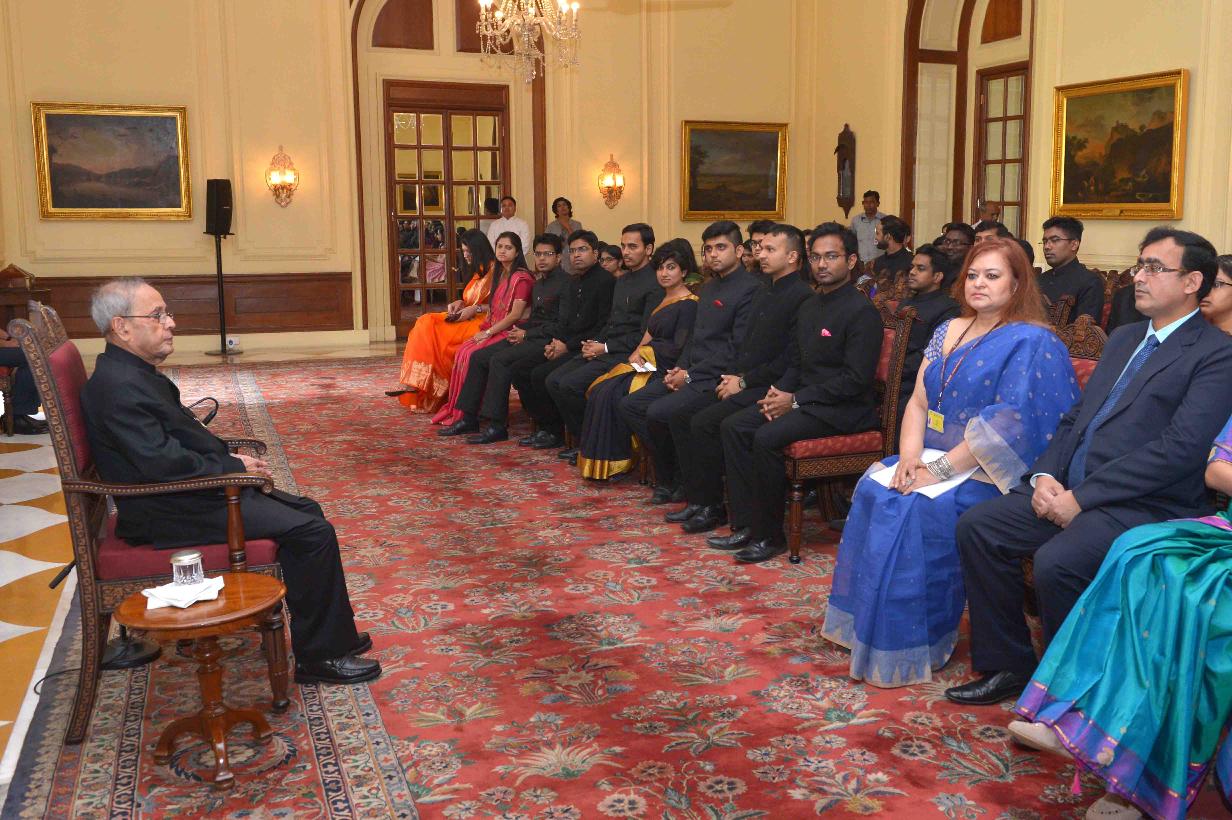 The President of India, Shri Pranab Mukherjee interacting with the Officer Trainees (2014 and 2015 Batch) of Indian Foreign Service from Foreign Service Institute, at Rashtrapati Bhavan on April 06, 2016.