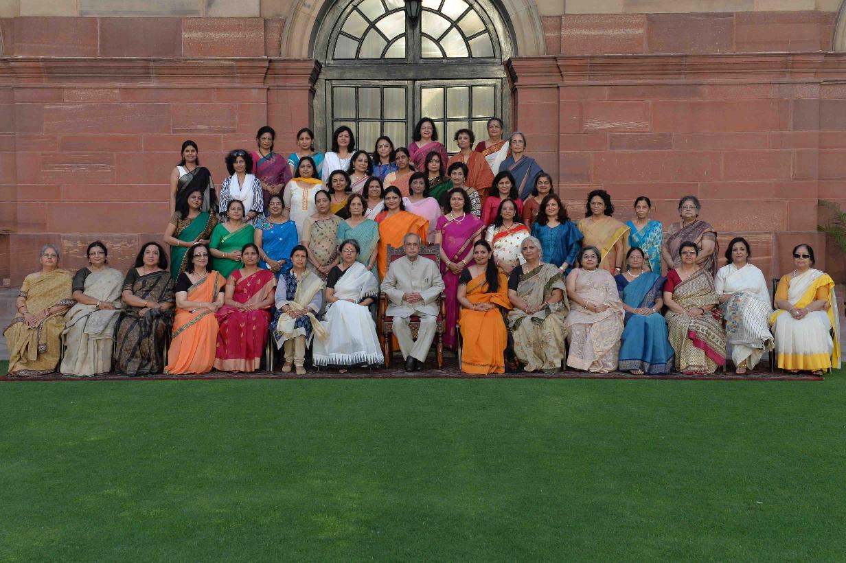 The President of India, Shri Pranab Mukherjee in Group Photographs with the members of IAS Officers' Wives Association, at Rashtrapati Bhavan on April 02, 2016.