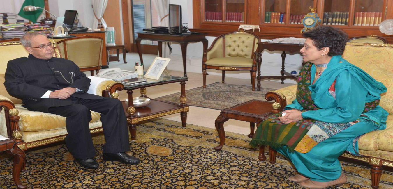 The President of India, Shri Pranab Mukherjee meeting with Smt. Praveen Mahajan, Administrative Member, CAT-Jodhpur Bench, at Rashtrapati Bhavan on February 04, 2016.