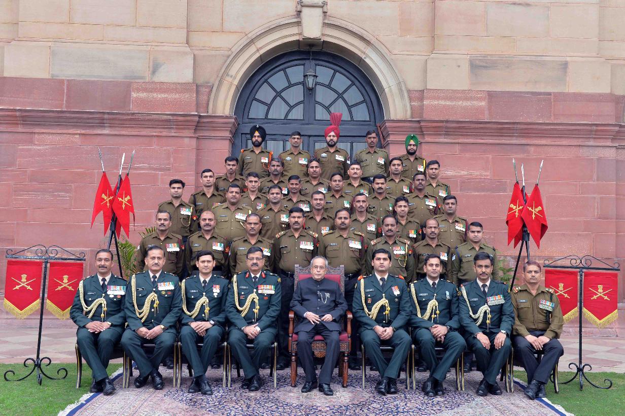 The President of India, Shri Pranab Mukherjee in a group photograph with the Army Contingent of Rashtrapati Bhavan on the occasion of Army Day, at Rashtrapati Bhavan on January 15, 2016.