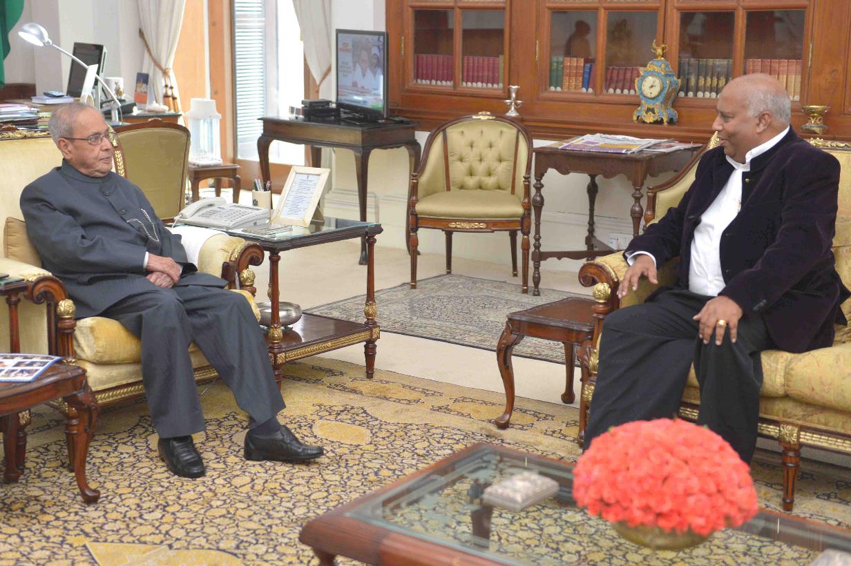 The President of India, Shri Pranab Mukherjee meeting with Shri Oscar Fernandes, MP (RS) alongwith Shri Gopal Pujari, MLA from Kollur, Karnataka, at Rashtrapati Bhavan on June 08, 2017.