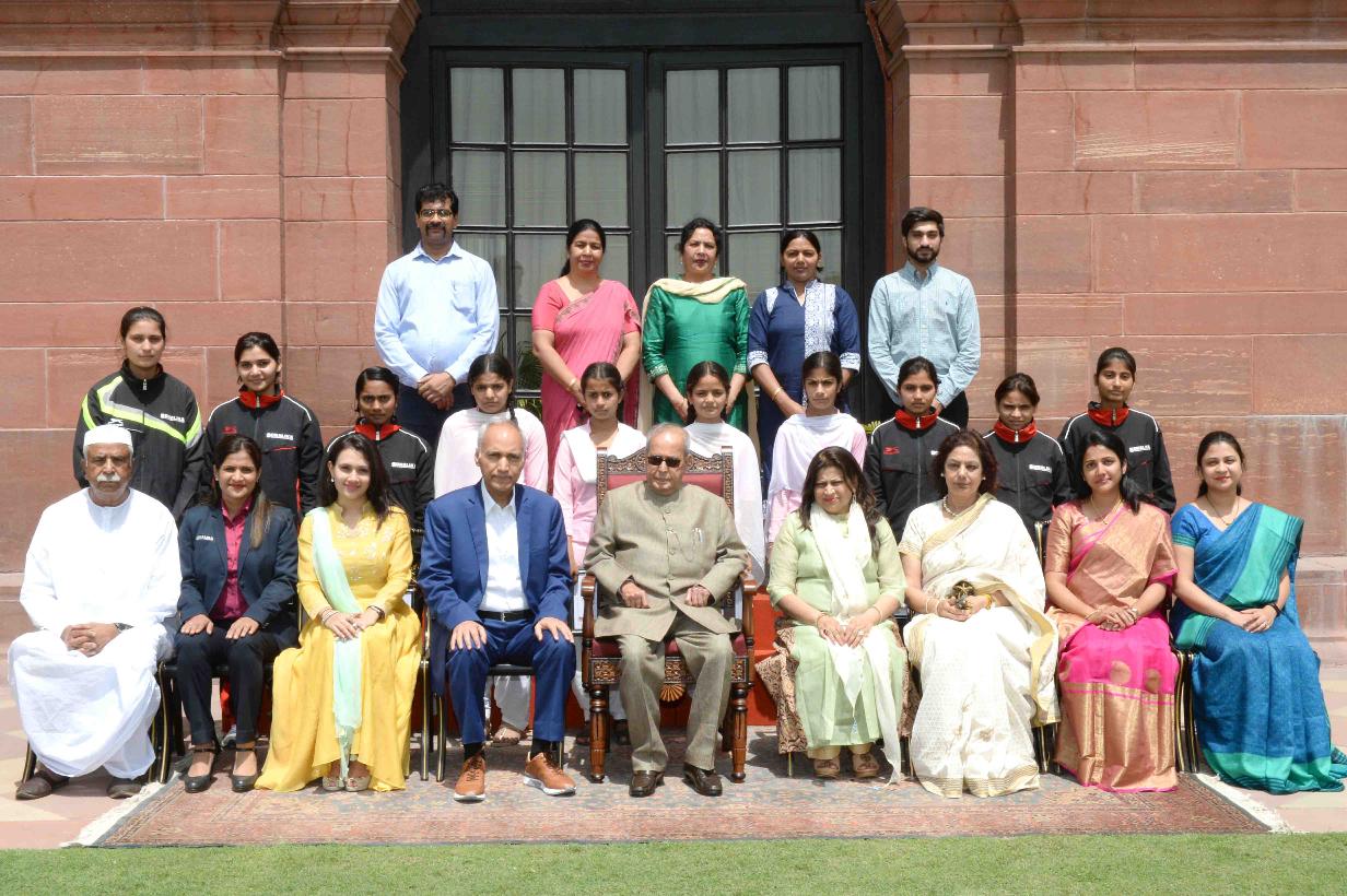 The President of India, Shri Pranab Mukherjee in Group Photographs with the girl shooters from Hoshiarpur and Gurgaon and officials of the Sonalika social Development Society, at Rashtrapati Bhavan on June 07, 2017.