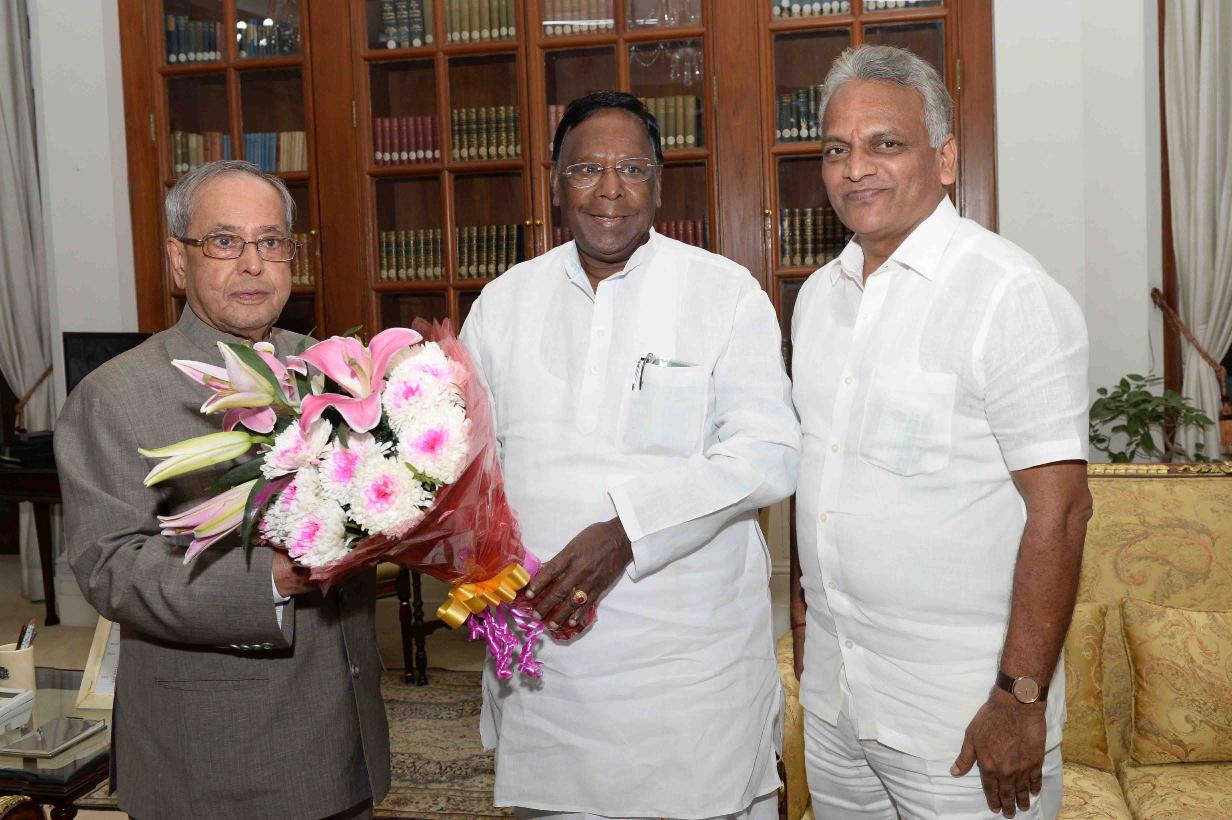 The President of India, Shri Pranab Mukherjee meeting with Shri V. Narayanasamy, Chief Minister of Puducherry alongwith Shri Vishwanathan, Ex-MP from Tamil Nadu and Shri Gopanna, Spokesperson, Tamil Nadu Pradesh Congress Committee, at Rashtrapati Bhavan on June 09, 2017.