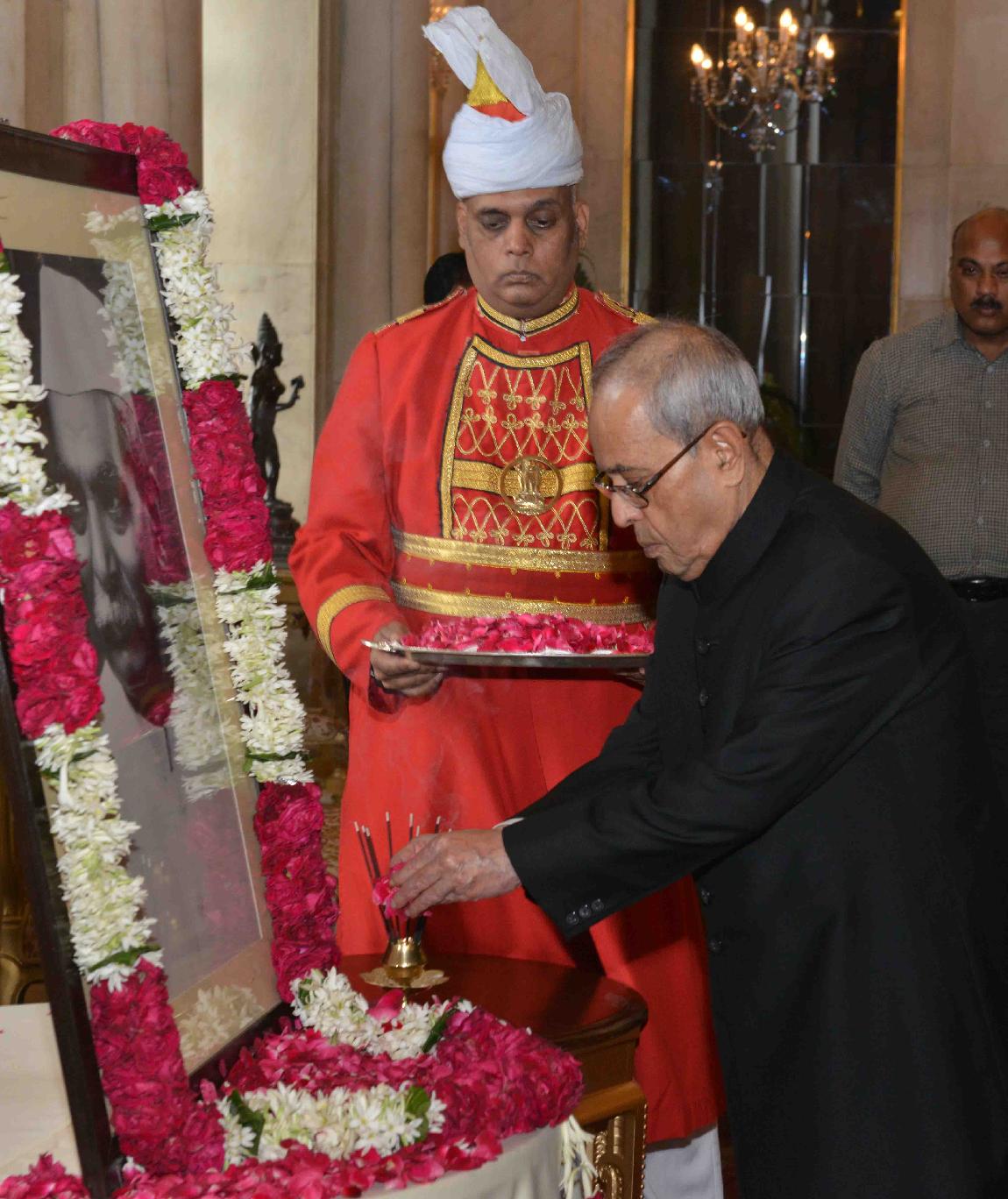 The President of India, Shri Pranab Mukherjee paying floral tributes at the portrait of Dr. Rajendra Prasad, former President of India on his Birth Anniversary, at Rashtrapati Bhavan on December 03, 2015. Family members of Dr. Rajendra Prasad also paying tributes to him.