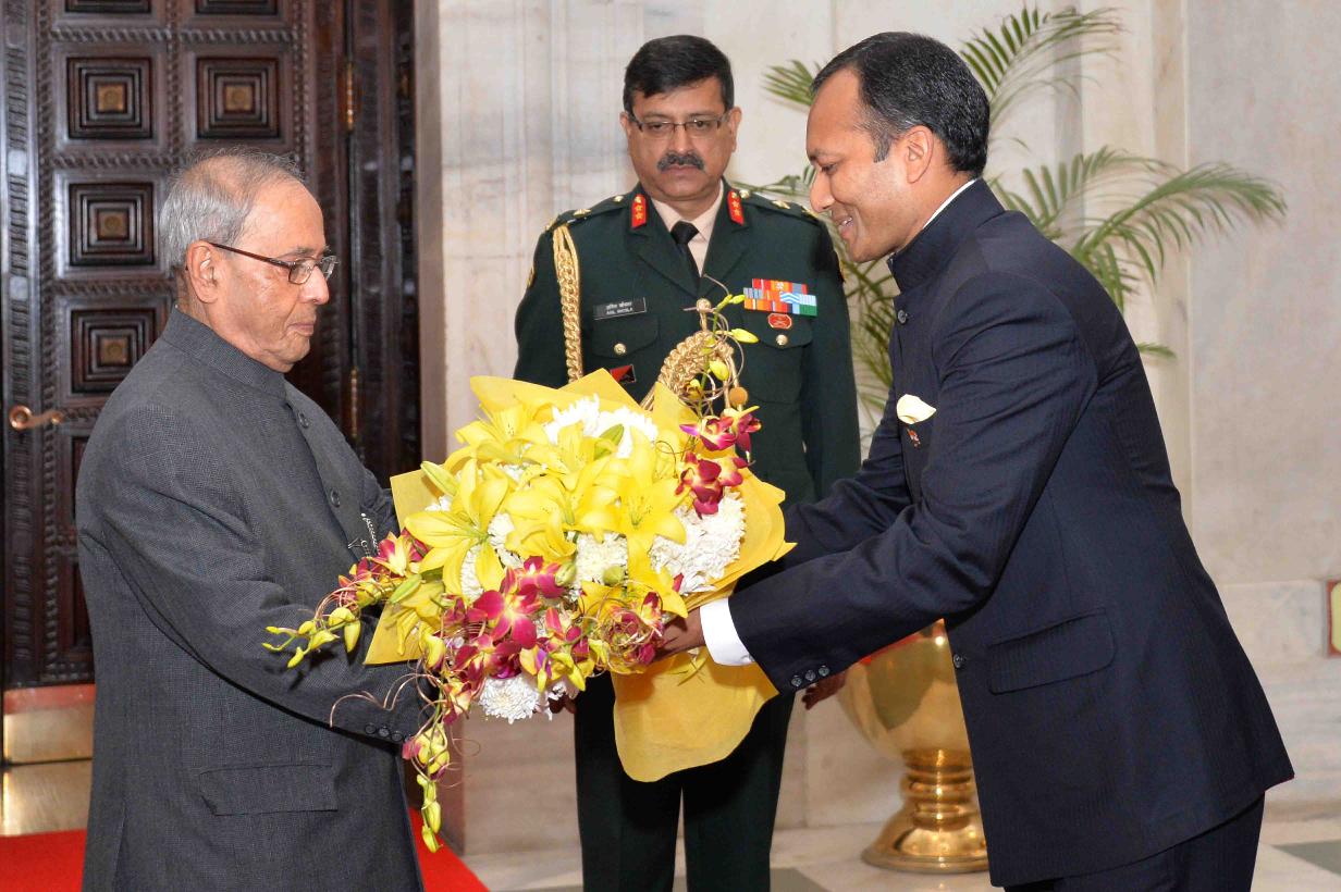 The President of India, Shri Pranab Mukherjee meeting with Smt. & Shri Anirban Choudhary, at Rashtrapati Bhavan on November 26, 2015.