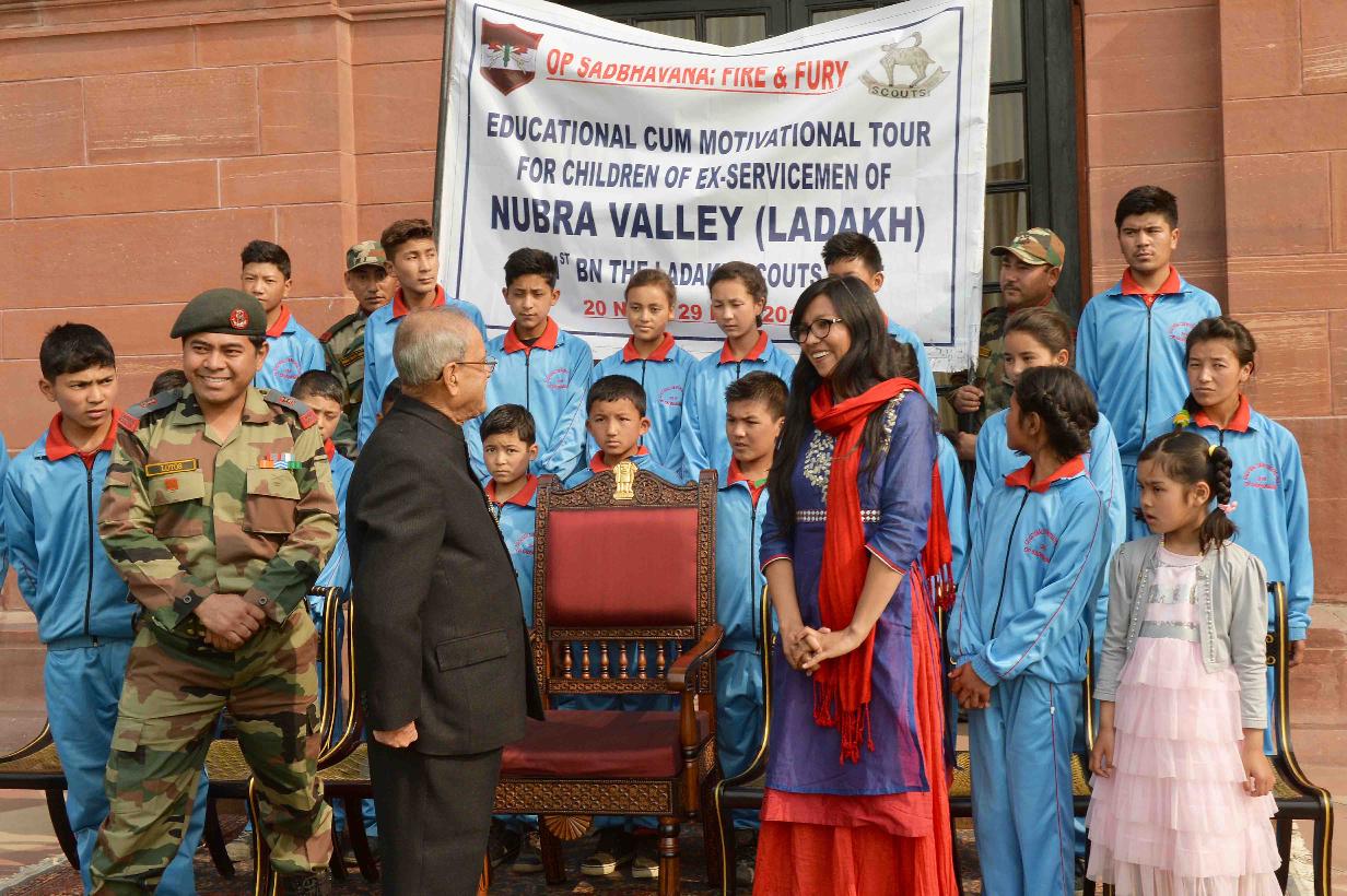 The President of India, Shri Pranab Mukherjee with the students from Nubra Valley (Ladakh) attending Operation Sadbhavana tour, organized by the HQ 102 Infantry Brigade (SIACHEN), at Rashtrapati Bhavan on November 23, 2015.