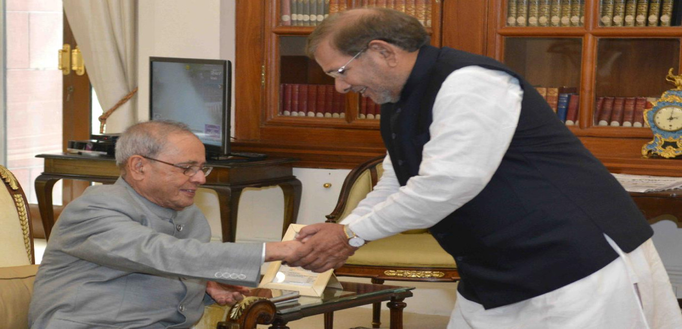 The President of India, Shri Pranab Mukherjee meeting with Shri Sharad Yadav, MP (RS) & President, Janata Dal (United), at Rashtrapati Bhavan, in New Delhi on November 10, 2015.