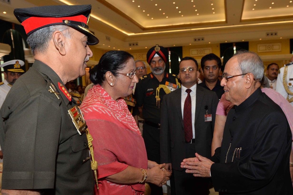 The President of India, Shri Pranab Mukherjee meeting with Lt. Gen. Jatinder Sikand, Engineer-in-Chief & Hony ADC to the President and Smt. Bindu Sikand, at Rashtrapati Bhavan, in New Delhi on September 23, 2015.