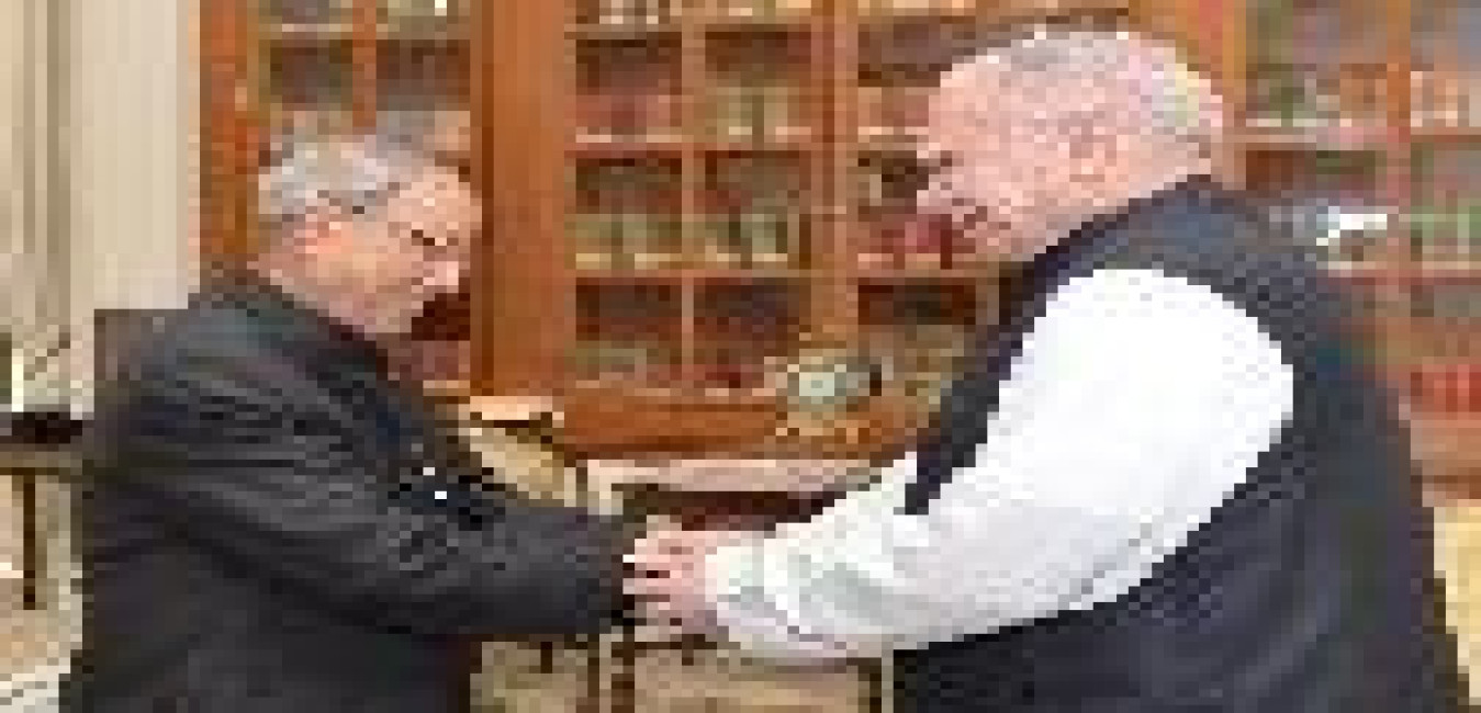 The President of India, Shri Pranab Mukherjee meeting with Marshal of the Indian Air Force Arjan Singh, at Rashtrapati Bhavan, in New Delhi on August 21, 2015.
