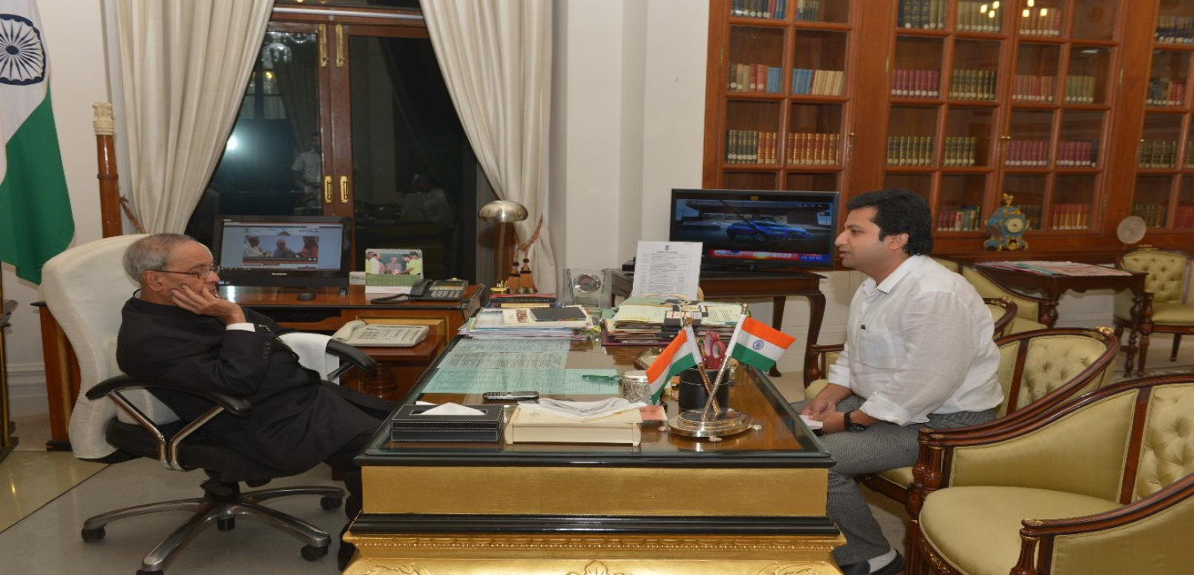 The President of India, Shri Pranab Mukherjee meeting with Shri Arindam Bhattacharya, at Rashtrapati Bhavan, in New Delhi on August 20, 2015.