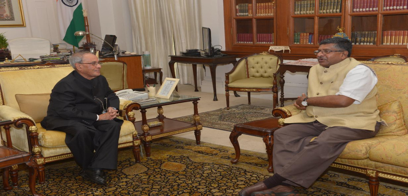 The President of India, Shri Pranab Mukherjee meeting with the Minister of Communication & Information Technology, Shri Ravi Shankar Prasad, at Rashtrapati Bhavan, in New Delhi on August 20, 2015.