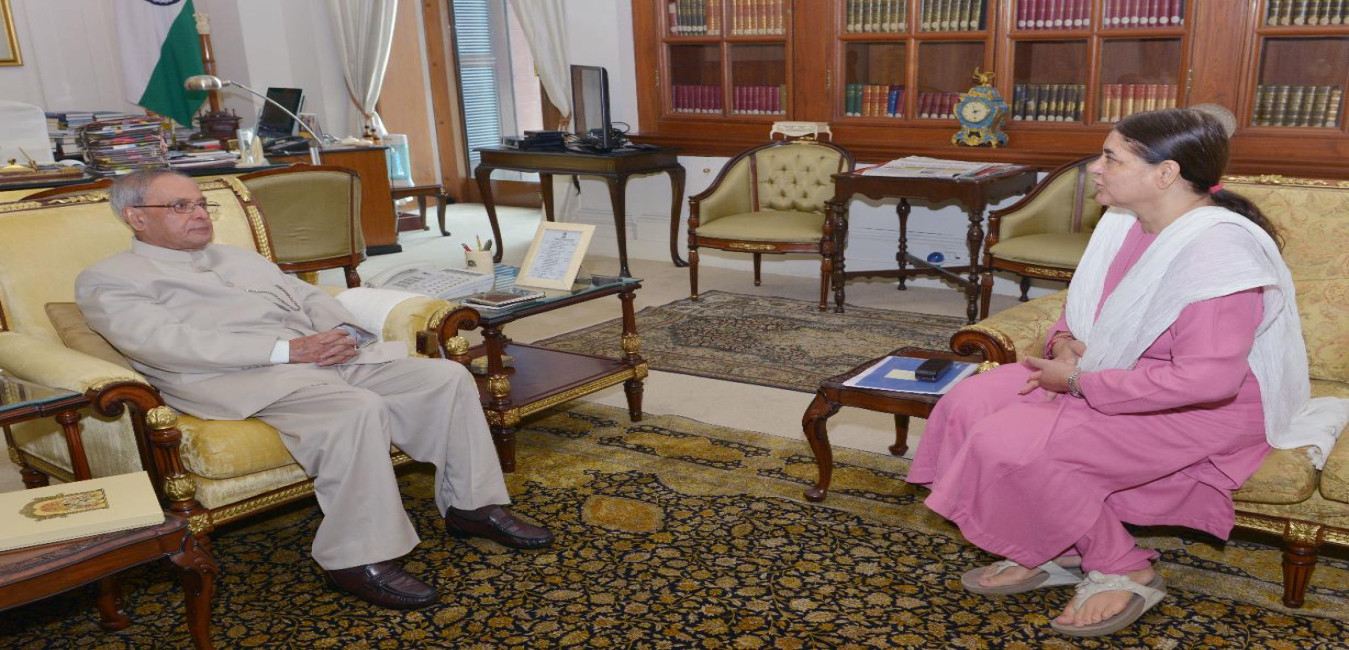 The President of India, Shri Pranab Mukherjee meeting the Minister of Women & Child Development, Smt. Maneka Sanjay Gandhi, at Rashtrapati Bhavan, in New Delhi on June 27, 2015.