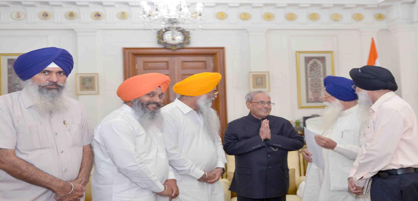 The President of India, Shri Pranab Mukherjee meeting with Prof. Kirpal Singh Badungar, President with office bearers from Shiromani Gurdwara Prabandhak Committee, Sri Amritsar, at Rashtrapati Bhavan on May 16, 2017.