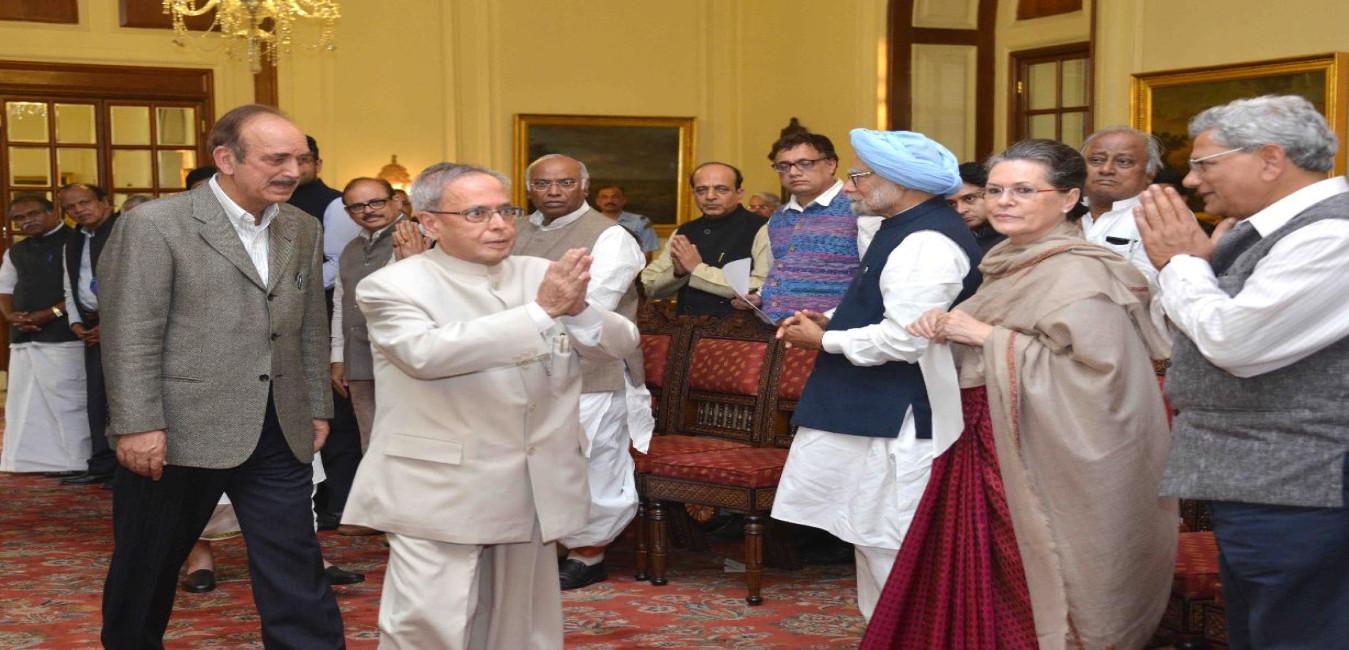 The President of India, Shri Pranab Mukherjee meeting with the delegation of leaders of the Indian National Congress, Janata Dal (United), Janata Dal (Secular), Samajwadi Party, All India Trinamool Congress, DMK, CPI(M), CPI, Rashtriya Janata Dal and Indian National Lok Dal, at Rashtrapati Bhavan, in New Delhi on March 17, 2015.