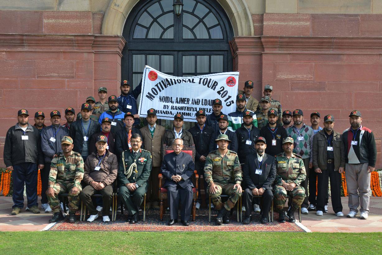 The President of India, Shri Pranab Mukherjee with the Senior Citizens, Sarpanch and Local Leaders from Doda and Kishtwar (Jammu & Kashmir) attending OP Sadbhavana tour organised by 26 Rashtriya Rifles (KUMAON), at Rashtrapati Bhavan, in New Delhi on January 28, 2015.