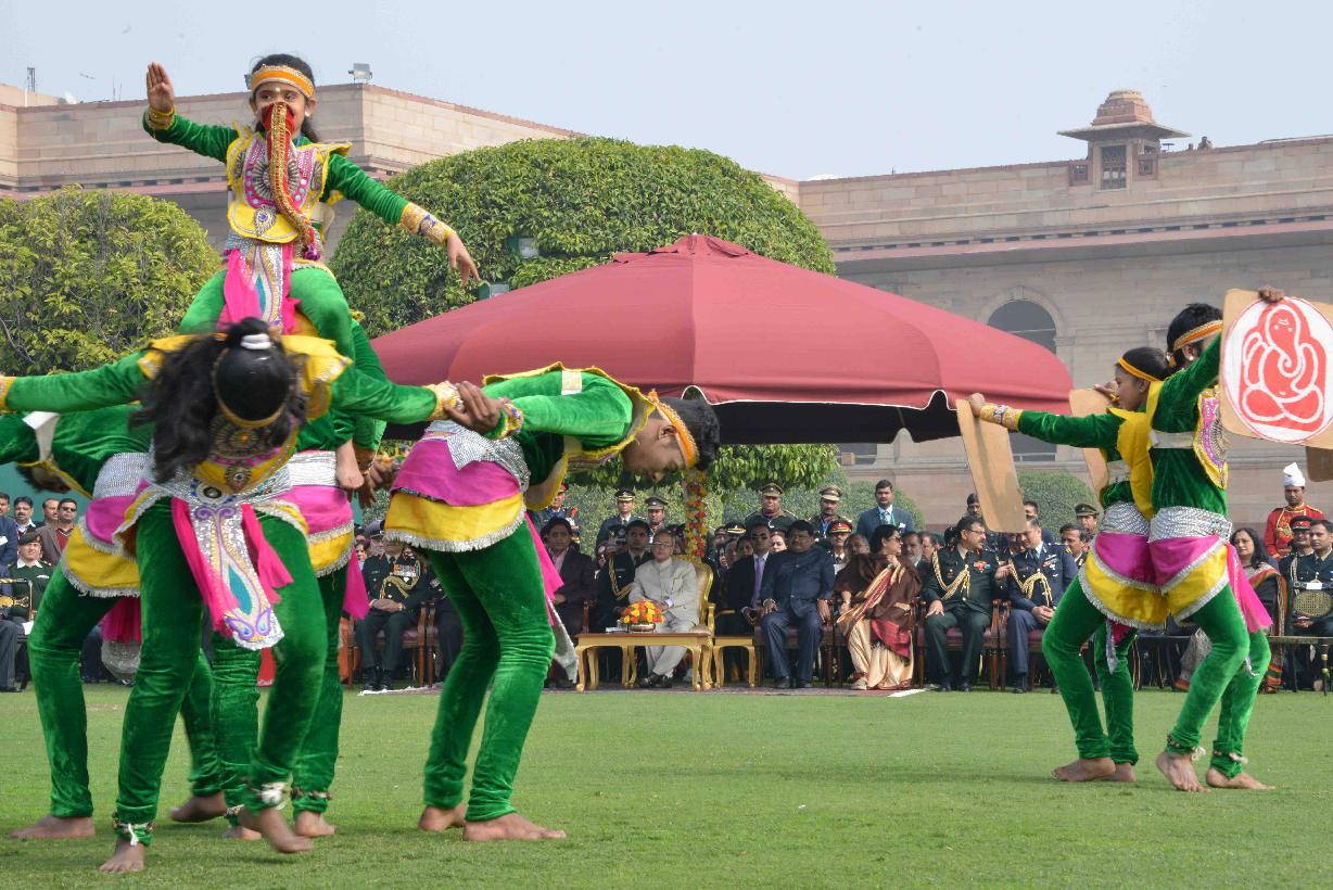 The President of India, Shri Pranab Mukherjee receiving the President of the United States of America, HE Mr Barack Obama during his Ceremonial Reception at the forecourt of Rashtrapati Bhavan, in New Delhi on January 25, 2015.