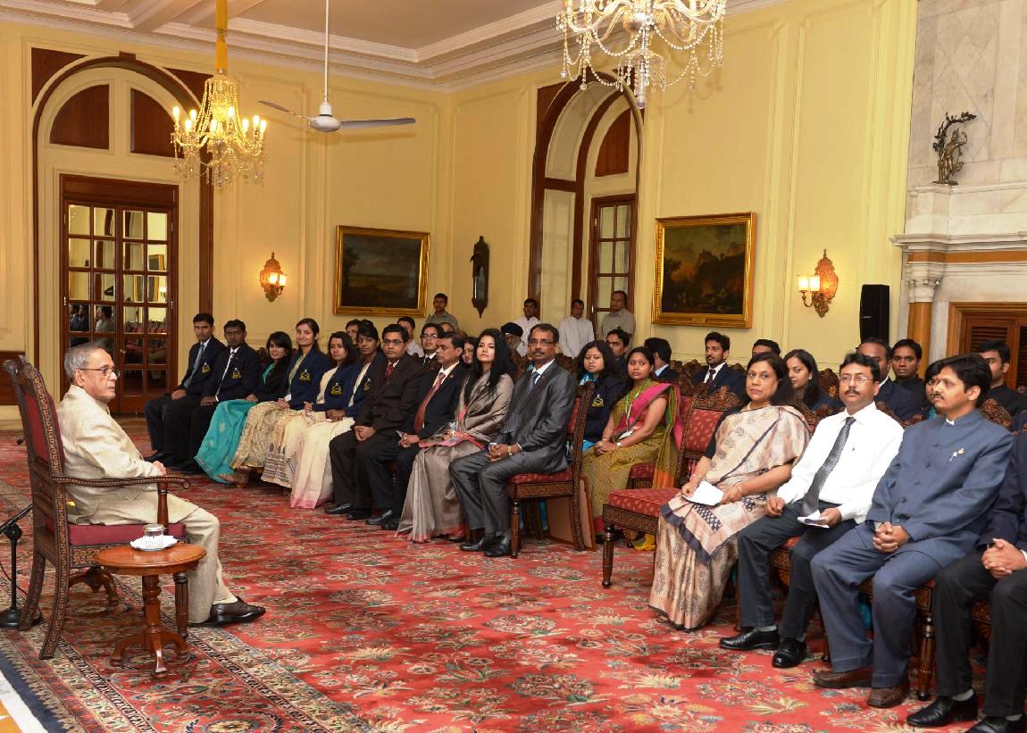 The President of India, Shri Pranab Mukherjee interacting with the Indian Postal Service Probationers of 2010-2013 Batches from Rafi Ahmed Kidwai National Postal Academy & Indian P&T Accounts & Finance Service Probationers from National Institute of Communication Finance, Ghaziabad at Rashtrapati Bhavan in New Delhi on April 16, 2014