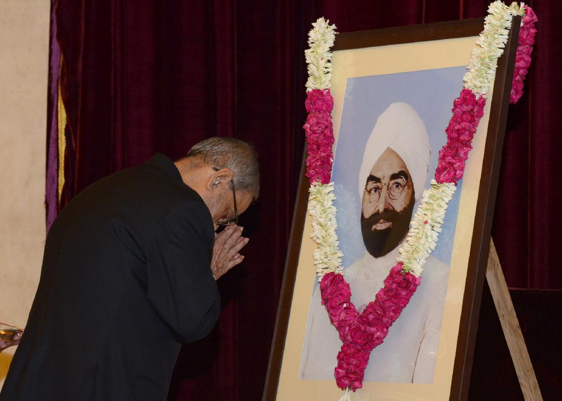 The President of India, Shri Pranab Mukherjee paying floral tributes to the Former President of India, Late Shri Giani Zail Singh on his Birth Anniversary at the Durbar Hall of Rashtrapati Bhavan in New Delhi on May 05, 2014