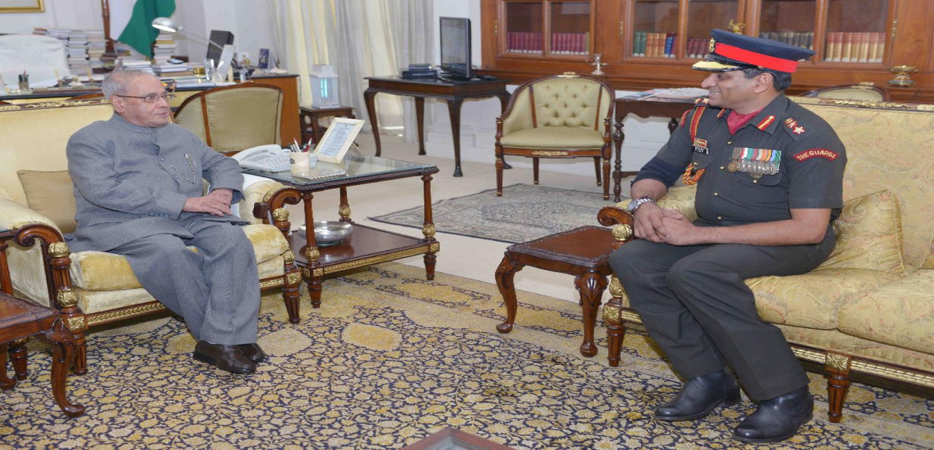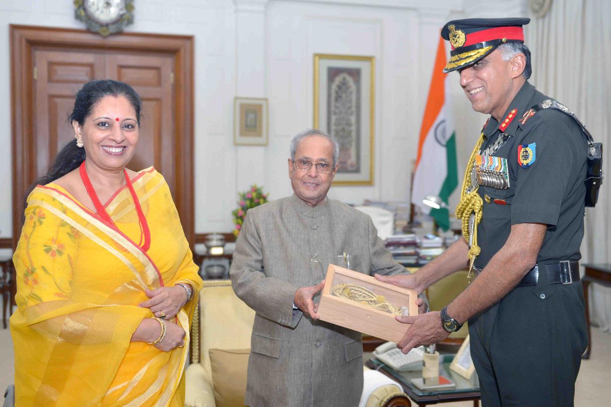 The President of India, Shri Pranab Mukherjee meeting with Lt. Gen. Vinod Vashisht, Director General, National Cadets Corps & Senior Colonel Commandant Regiment of Artillery and Hony ADC to the President along with his family members, at Rashtrapati Bhavan on May 04, 2017.