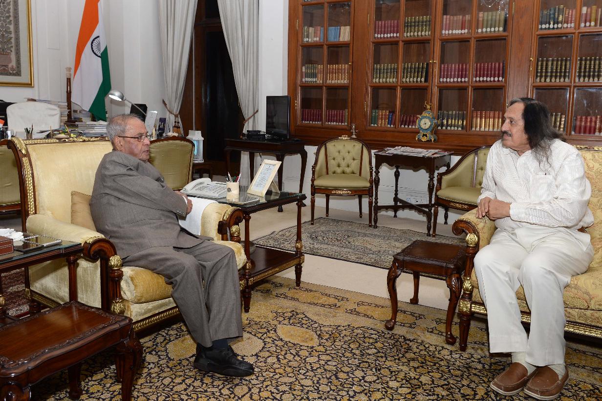 The President of India, Shri Pranab Mukherjee meeting with Dr. Susobhan Banerjee from Bolpur, at Rashtrapati Bhavan on May 06, 2017.