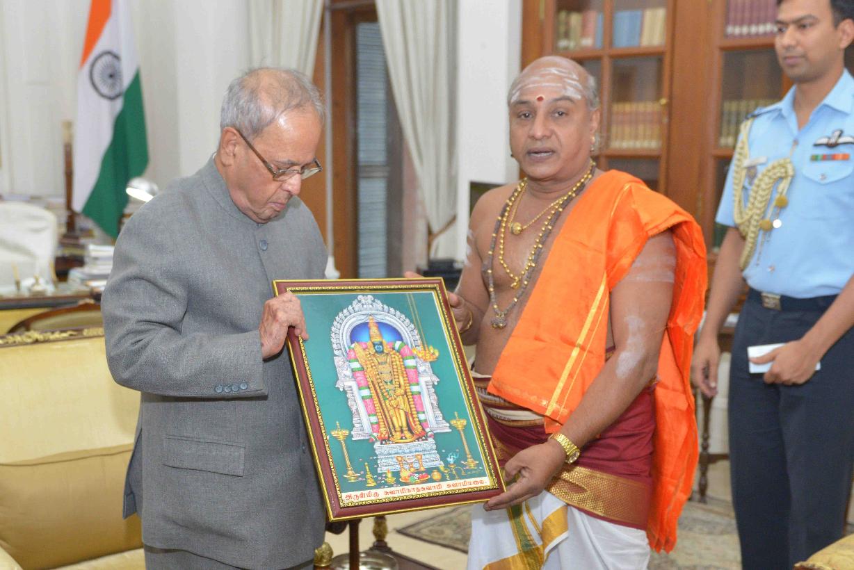 The President of India, Shri Pranab Mukherjee meeting with Dr. A.V. Ramana Dikshitulu, Pradhan Archaka & Agam Advisor, TT Devasthanam, Tirupati with others, at Rashtrapati Bhavan on May 04, 2017.