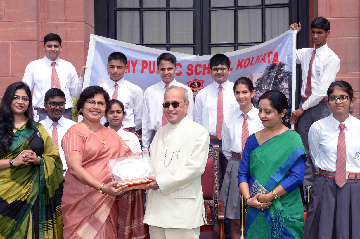 The President of India, Shri Pranab Mukherjee meeting with the students and teachers from Army Public School, Kolkata, at Rashtrapati Bhavan on May 03, 2017.