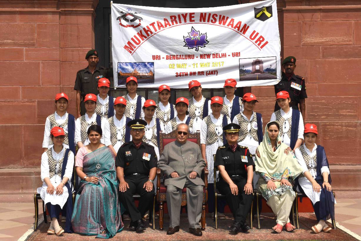 The President of India, Shri Pranab Mukherjee in Group Photograph with the Girl Students from Uri, Jammu & Kashmir attending National Integration Tour, organised by 34 RR/15 Corps of Northern Command, at Rashtrapati Bhavan on May 08, 2017.