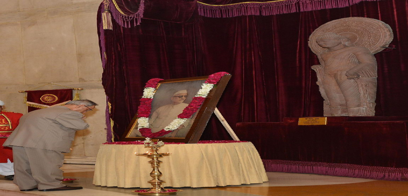 The President of India, Shri Pranab Mukherjee paying floral tributes at the Portrait of the Former President of India, Dr Zakir Hussain on the Occasion of his Birth Anniversary at Darbar Hall of Rashtrapati Bhavan in New Delhi on Feb 08, 2014