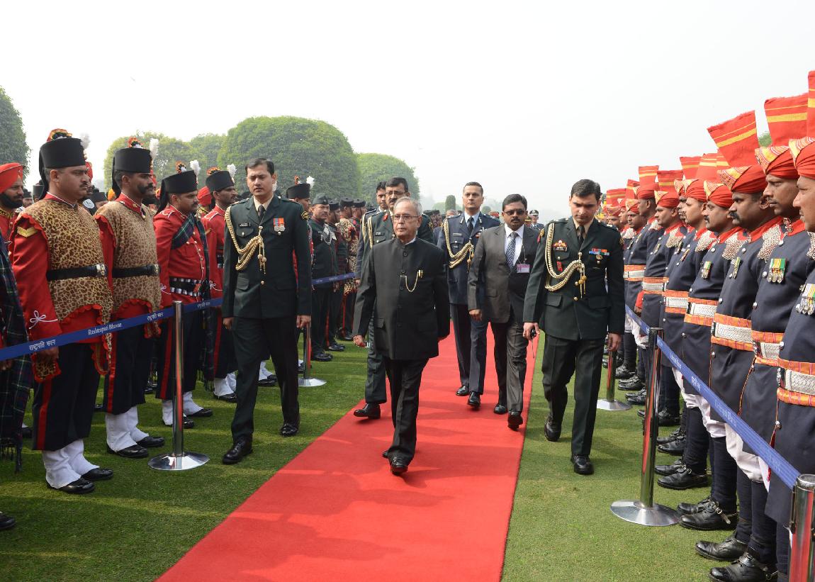 The President of India, Shri Pranab Mukherjee at the Forecourt of Rashtrapati Bhavan before departure for attending the Beating Retreat Function at Vijay Chowk in New Delhi on Jan 29, 2014