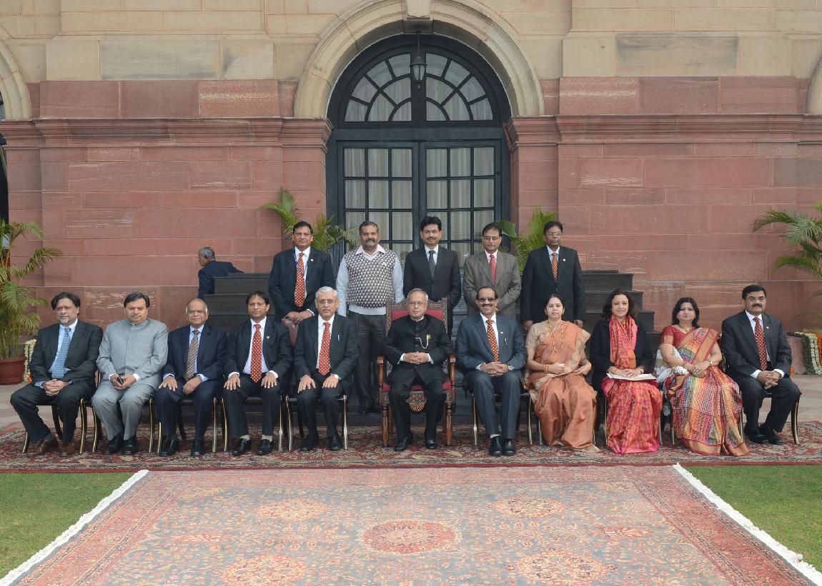 The President of India, Shri Pranab Mukherjee presenting the Country's Highest Civilian Award Bharat Ratna to Eminent Scientist Professor, C N R Rao and Legendary Cricketer, Shri Sachin Tendulkar at Durbar Hall of Rashtrapati Bhavan in New Delhi on Feb 04, 2014