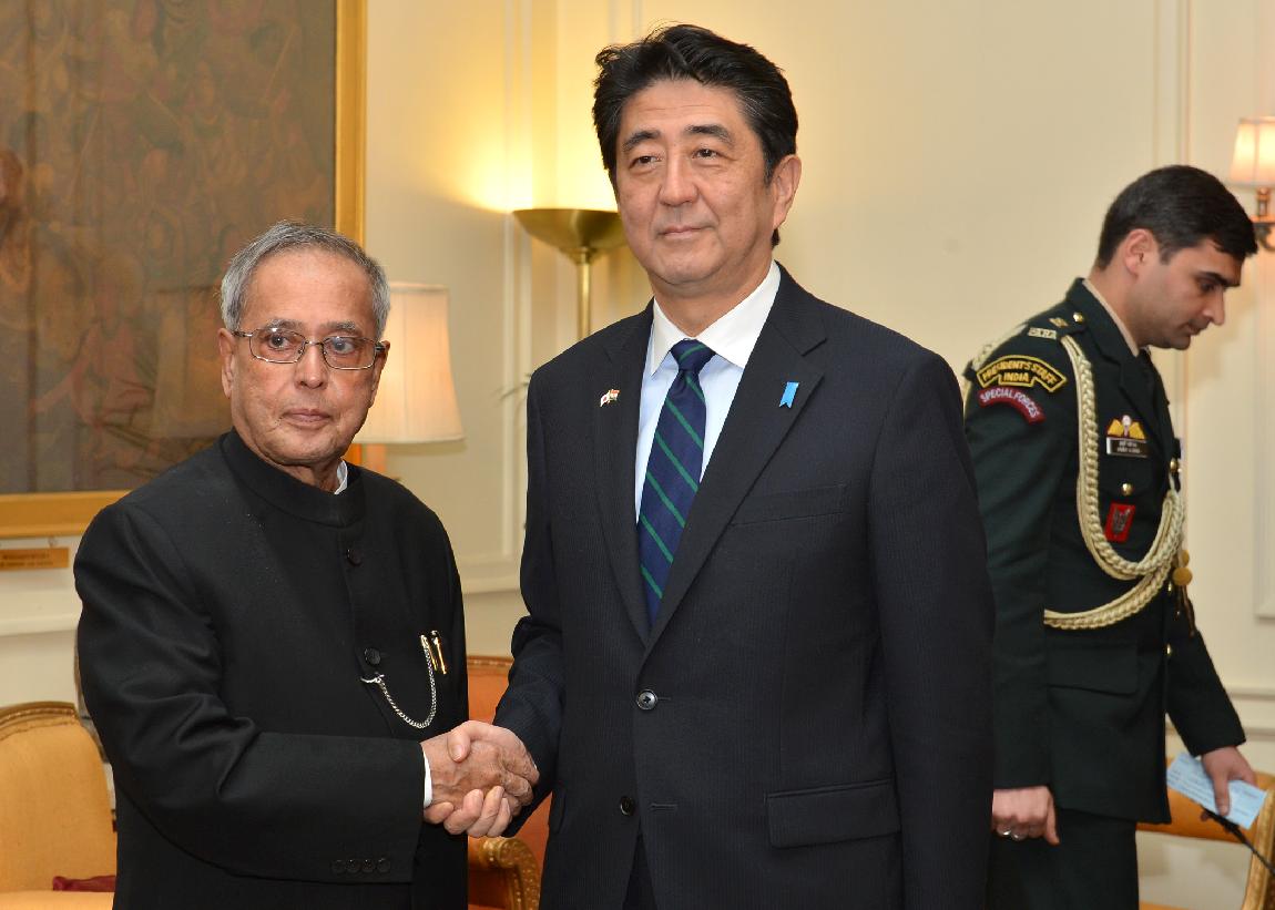 The Chief Guest for the 65th Republic Day 2014 Celebrations, the Prime Minister of Japan, HE Mr Shinzo Abe calling on the President of India, Shri Pranab Mukherjee at Rashtrapati Bhavan in New Delhi on Jan 25, 2014