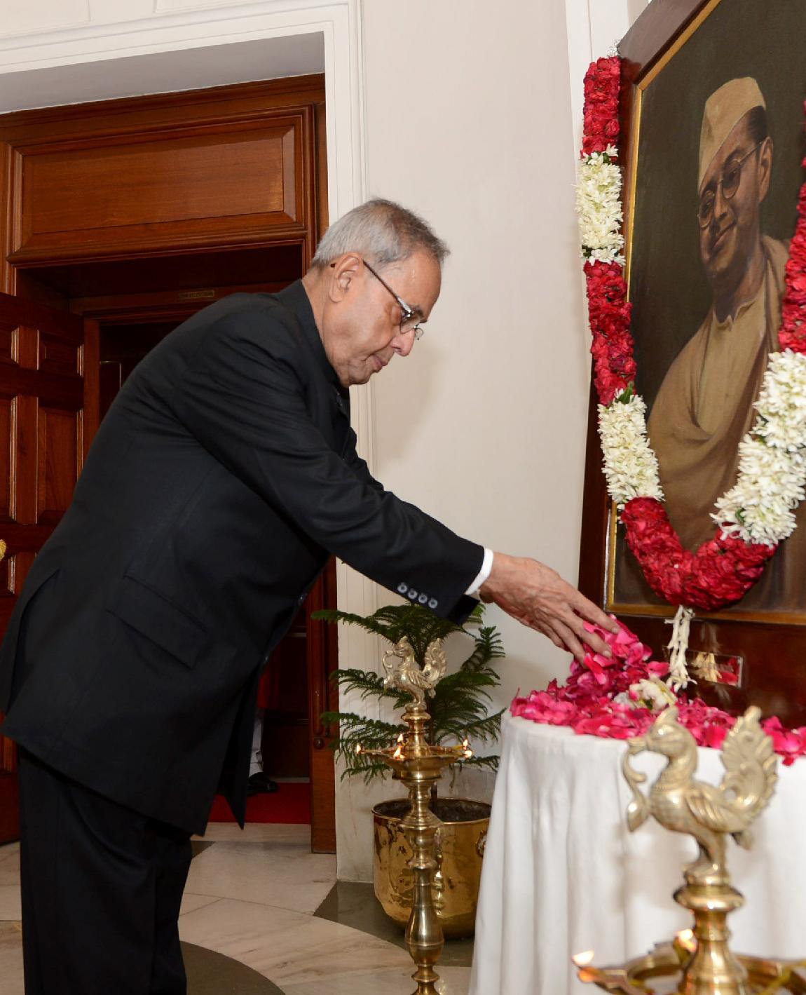 The President of India, Shri Pranab Mukherjee paying floral tributes at the Portrait of Netaji Subhash Chandra Bose on the occasion of Netaji s Birth Anniversary at Rashtrapati Bhavan in New Delhi on Jan 23, 2014