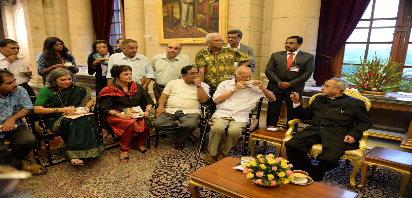 The President of India, Shri Pranab Mukherjee interacting with the Members of Indian Association of Foreign Affairs Correspondents at Rashtrapati Bhavan in New Delhi on Oct 17, 2013