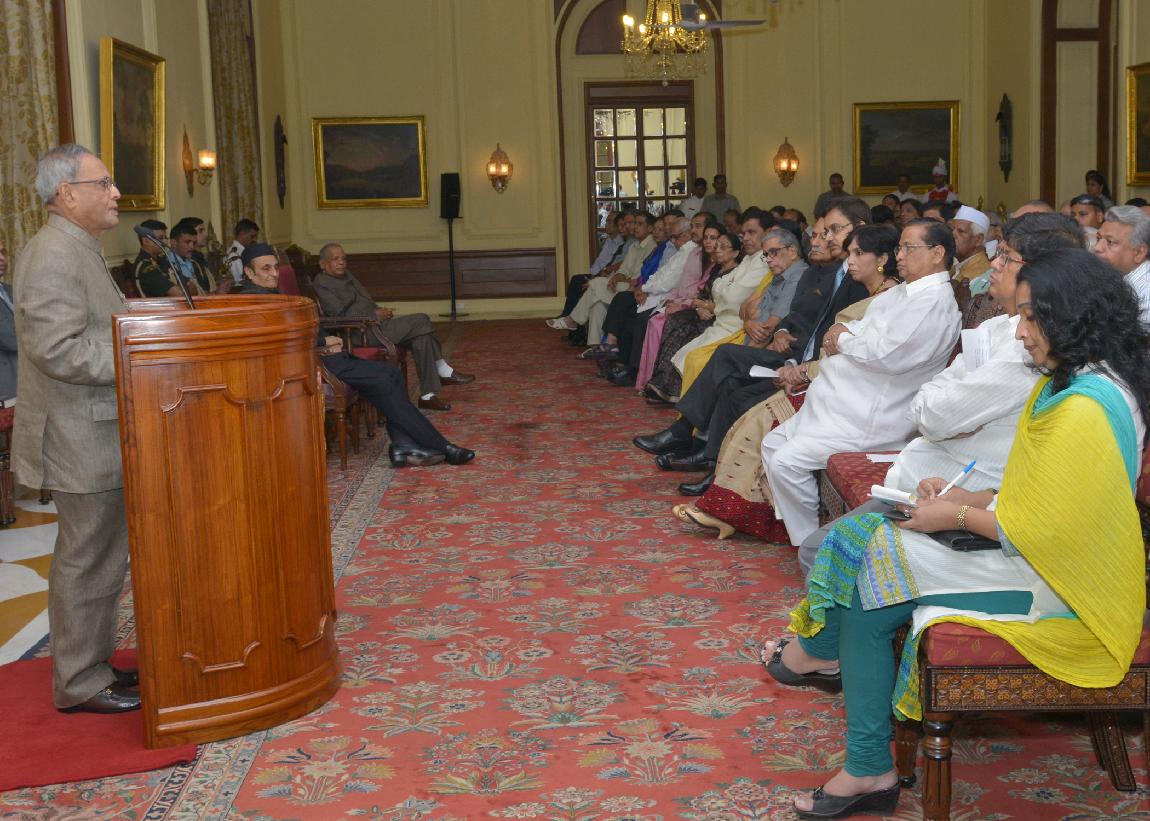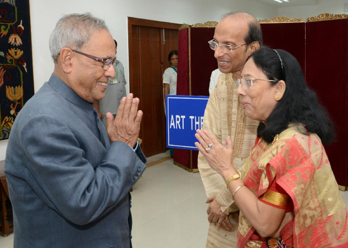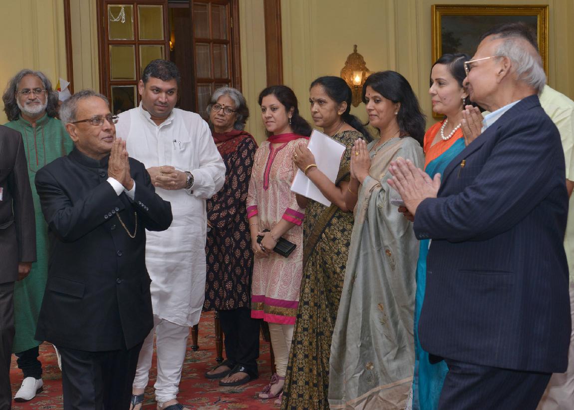 The President of India, Shri Pranab Mukherjee Interacting with Member Delegates from Rajasthan Forum Kolkata led by Shri Vishwa Mohan Bhatt at Rashtrapati Bhavan in New Delhi on Aug 19, 2013
